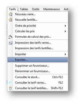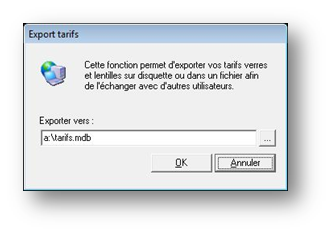 L’export des tarifs verre et lentille permet la copie de ces tarifs sur disquette (en vue par exemple de mettre à jour un magasin qui ne dispose pas d’Internet).