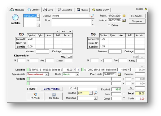 Comme précédemment, l’édition d’une fiche lentille ou d'autres documents peut se faire en cliquant sur le bouton « F6. Atelier » et l’enregistrement des paiements ou le calcul des remboursements en cliquant sur le bouton « F5. Vente ». Les lentilles peuvent également être commandées selon le même principe que pour les verres.