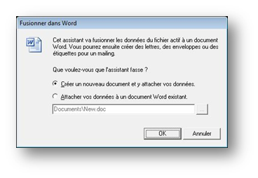 Lorsque cette option est sélectionnée dans le menu du bouton Exporter, l’ordinateur propose de créer un nouveau document ou d’utiliser un document existant. Il est en effet possible de sauvegarder différents modèles de lettres et les réutiliser ensuite pour les mailings.