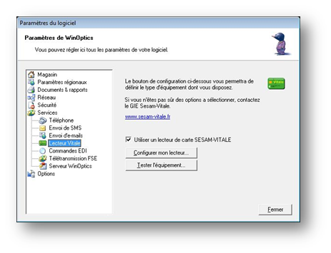 Pour configurer un lecteur de carte Vitale dans WinOptics, il suffit de suivre les étapes ci-dessous. Se reporter également à notre site Internet pour des informations spécifiques à certains lecteurs : //www.winoptics.com/index.php?tpage=vitale
