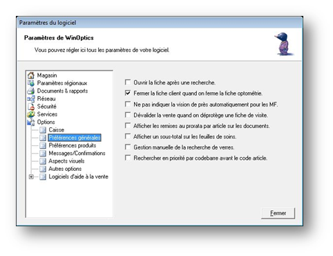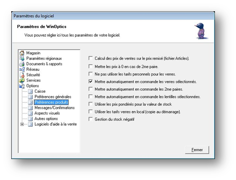 Les onglets Préférence générales et Préférences produits permettent de sélectionner des comportements particuliers du logiciel parmi la liste proposée :
