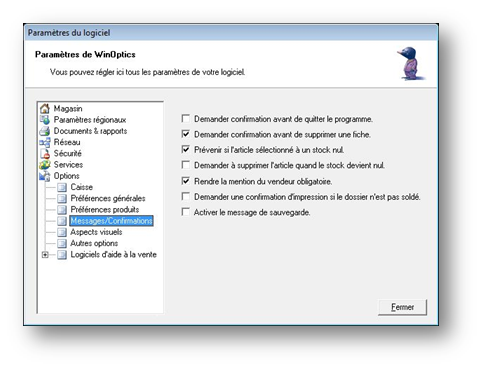 L’onglet Messages/confirmations permet de préciser à quel moment des messages doivent être affichés par le logiciel :