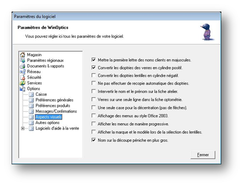 L’onglet Aspects visuels, regroupe une série de paramètres qui permettent de gérer l’affichage ou le mode de fonctionnement de WinOptics. Ces paramètres peuvent être utilisés pour adapter au mieux le logiciel aux besoins de l’utilisateur :