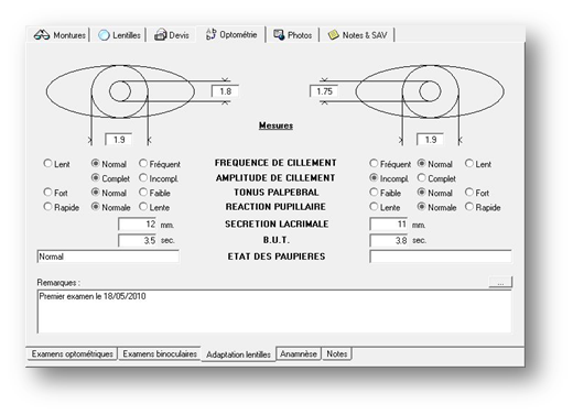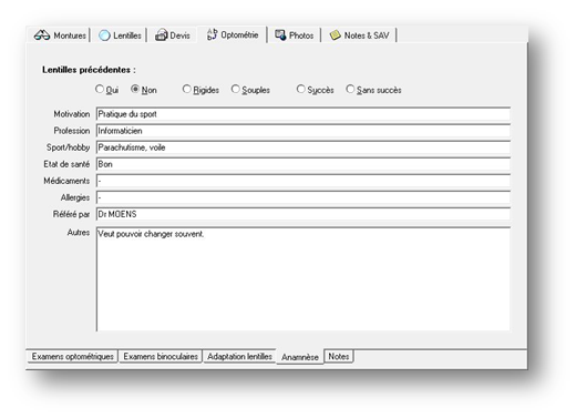 Les onglets Adaptation lentilles et Anamnèse permettent une étude plus complète du patient concernant la gestion des lentilles de contact.