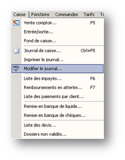 Pour pouvoir modifier le journal de caisse, il suffit de sélectionner l’option Modifier le journal du menu Caisse :