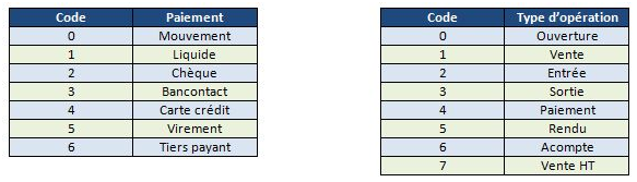 Comme le fichier est « brut », les modes de paiement et les types d’opération sont remplacés par des codes. Ci-dessous les tableaux de correspondance de ces codes :