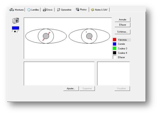 L’onglet Photos permet, tout comme dans la fiche clients ou articles, de référencer une série d'images, mais également d'annoter un schéma des yeux. Celui-ci peut être utilisé pour marquer des vaisseaux ou des tâches sur l’œil.