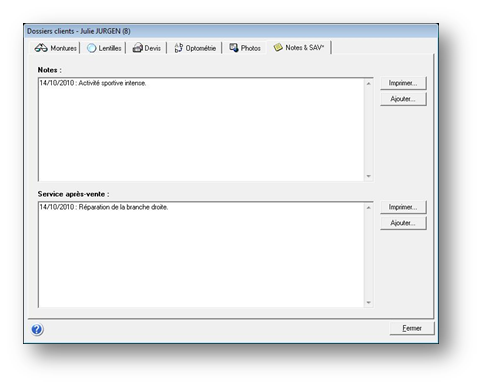 L’onglet Notes & SAV permet principalement de saisir des informations sur les ventes et réparations réalisées.